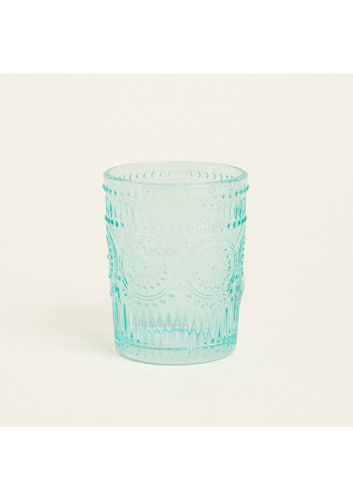 Γυάλινο ποτήρι με ανάγλυφο σχέδιο σε βεραμάν απόχρωση ( 8 x 10 cm), ιδανικό για να σερβίρετε νερό ή ποτό. Συνδύασε το με τα υπόλοιπα προϊόντα της κατηγορίας για ένα ολοκληρωμένο art de la table.