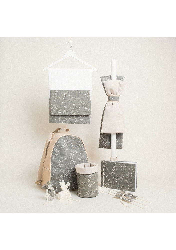 Ένα κομψό και φυσικό σετ βάπτισης με κλαδιά και λαδί φόντο, ιδανικό για μια ήρεμη και μοντέρνα βάπτιση.