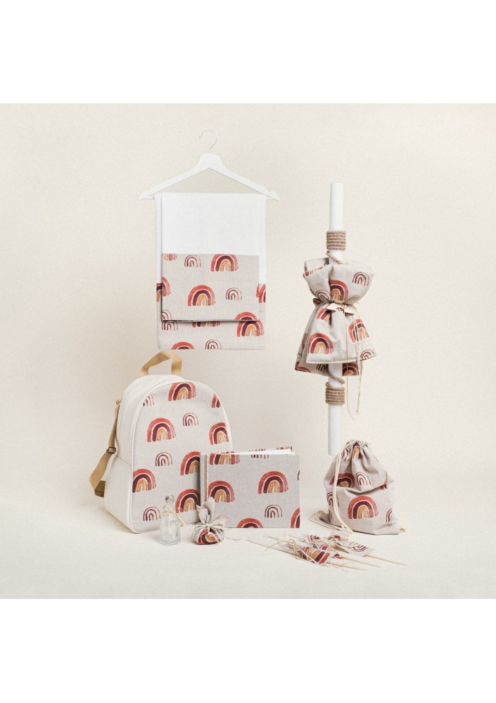 Ένα χαρούμενο και πολύχρωμο σετ βάπτισης σε κεραμιδί απόχρωση με θέμα το ουράνιο τόξο, ιδανικό για μια ζωντανή και γεμάτη χρώματα βάπτιση.
