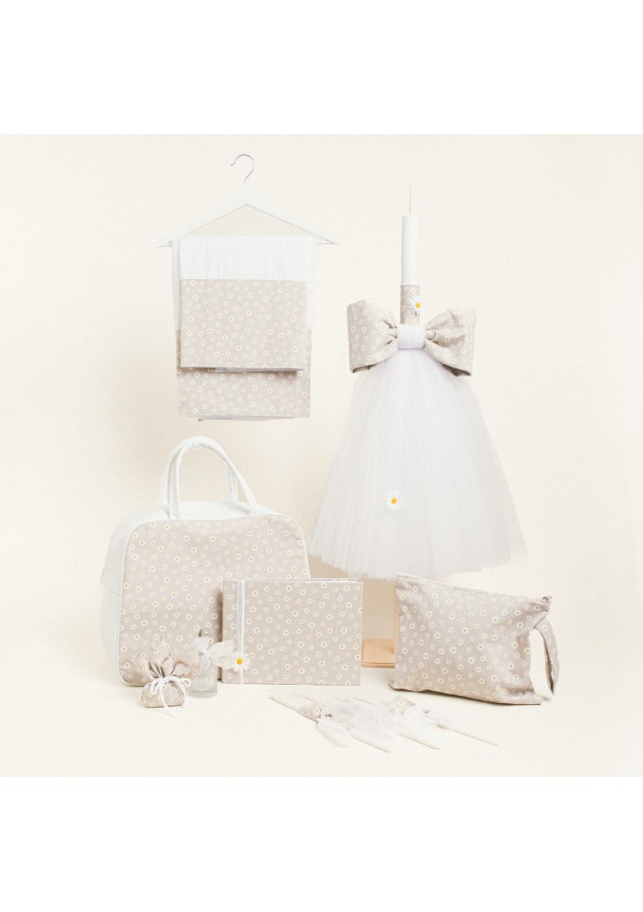 Ένα γλυκό και φρέσκο σετ βάπτισης με θέμα τις μικρές μαργαρίτες, ιδανικό για μια βάπτιση γεμάτη φυσική ομορφιά και τρυφερότητα.
