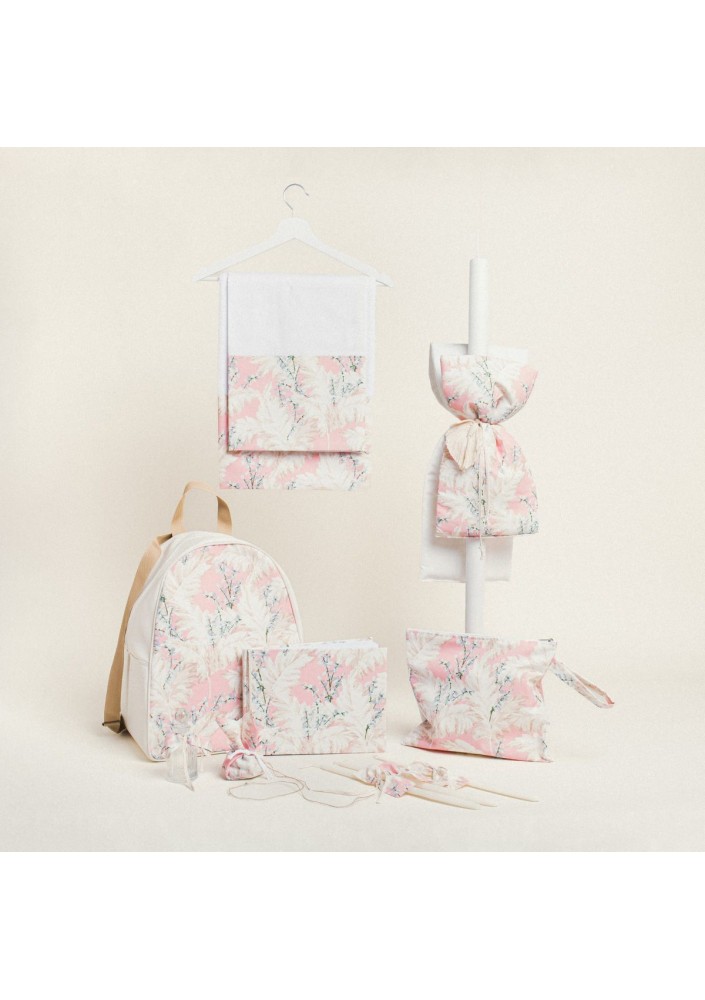 Ένα κομψό και ολοκληρωμένο σετ βάπτισης σε ζεστή σομόν απόχρωση με boho αισθητική, ιδανικό για μια ξεχωριστή βάπτιση.