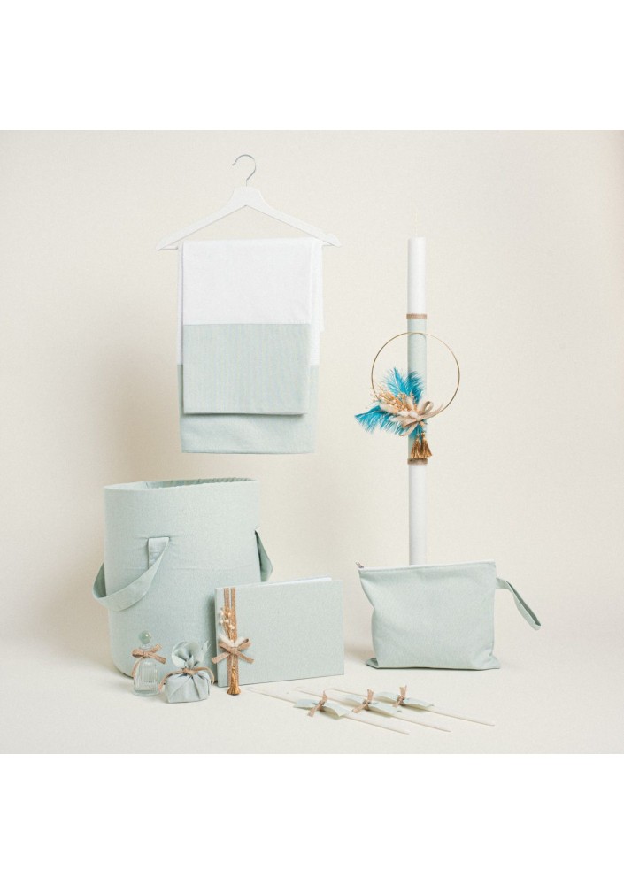 Ένα κομψό και εντυπωσιακό σετ βάπτισης με χρυσό στεφάνι διακοσμημένο με αποξηραμένα λουλούδια, ιδανικό για μια βάπτιση που συνδυάζει την πολυτέλεια με τη φυσική ομορφιά.