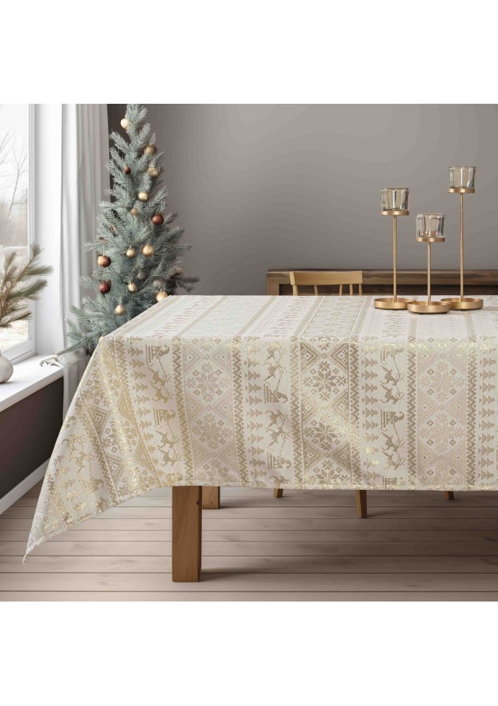 Περιγραφή Προϊόντος **Τραπεζομάντηλο Ζακάρ Παραδοσιακό με Χρυσά Χριστουγεννιάτικα Σχέδια** Αυτό το κλασικό και κομψό τραπεζομάντηλο ζακάρ προσθέτει μια νότα πολυτέλειας και παράδοσης στη χριστουγεννιάτικη διακόσμηση του σπιτιού σας. Με διακριτικά χρυσά χριστουγεννιάτικα σχέδια, αναδεικνύει τη γιορτινή ατμόσφαιρα με μια διαχρονική λάμψη. Χαρακτηριστικά - Διαστάσεις: Διατίθεται σε τρία μεγέθη για να καλύψει κάθε ανάγκη: - 135 x 135 cm - 135 x 180 cm - 135 x 220 cm - **Σύνθεση**: 50% βαμβάκι, 50% πολυεστέρας. - Ο συνδυασμός βαμβακιού και πολυεστέρα προσφέρει μια αίσθηση απαλότητας και άνεσης, ενώ παράλληλα διευκολύνει τη φροντίδα του. Ιδανικό για το χριστουγεννιάτικο τραπέζι, το τραπεζομάντηλο αυτό συνδυάζει κλασική και παραδοσιακή αισθητική, φέρνοντας γιορτινή ζεστασιά και λάμψη στο χώρο σας.