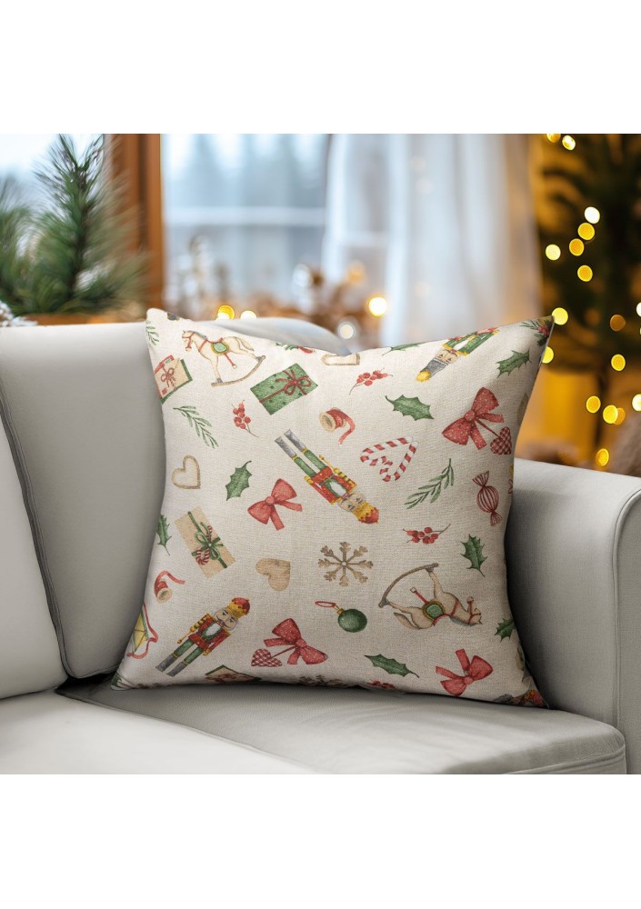Μαξιλαροθήκη Καρυοθραύστης - Παιχνίδια, κατασκευασμένη από μαλακό ύφασμα με σχέδιο εμπνευσμένο από το κλασικό έργο "Ο Καρυοθραύστης" και παραμυθένια παιχνίδια. Ιδανική για να προσδώσει μία μαγευτική και παιχνιδιάρικη ατμόσφαιρα στον χώρο, ιδιαίτερα κατά την περίοδο των Χριστουγέννων.