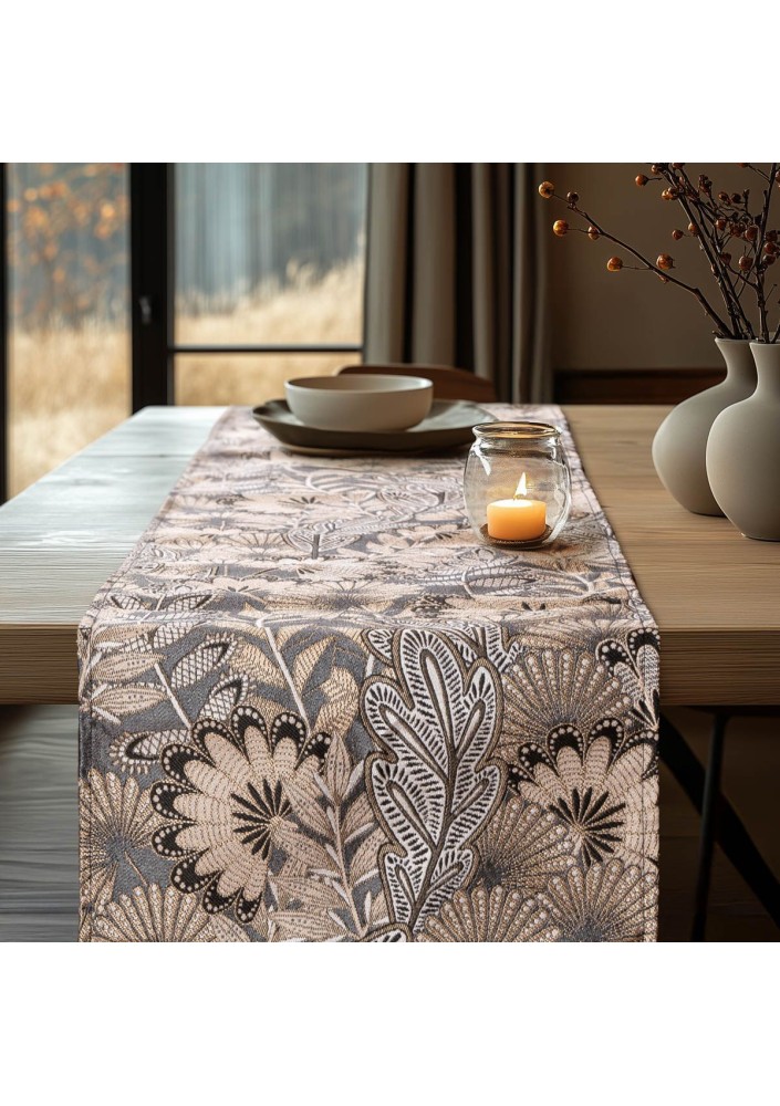 Σχέδιο: Το ράννερ διαθέτει μοναδικό σχέδιο με φύλλα στο boho στυλ, το οποίο προσδίδει φυσική και χαλαρή αίσθηση στον χώρο. Υλικό: Κατασκευασμένο από υλικό ζακάρ, το οποίο προσφέρει ανθεκτικότητα και μαλακή αίσθηση στην αφή. Διαστάσεις: Ιδανικό για τραπέζια, κονσόλες ή άλλες επιφάνειες, δίνοντας μια αίσθηση οργανικότητας και φυσικότητας στον χώρο σας. Στυλ: Το boho σχέδιο συνδυάζει παραδοσιακά μοτίβα με μοντέρνα αισθητική, κάνοντάς το ιδανικό για διακόσμηση σε χώρους με φυσικά υλικά και χαλαρή ατμόσφαιρα. Πολυχρηστικότητα: Ιδανικό για καθημερινή χρήση αλλά και για ειδικές περιστάσεις, όπως γάμους, βαφτίσεις ή άλλες εορταστικές εκδηλώσεις. Αυτό το ράννερ είναι τέλειο για να προσδώσει μια boho αίσθηση σε οποιοδήποτε δωμάτιο ή τραπέζι, δημιουργώντας μια ατμόσφαιρα χαλάρωσης και κομψότητας.
